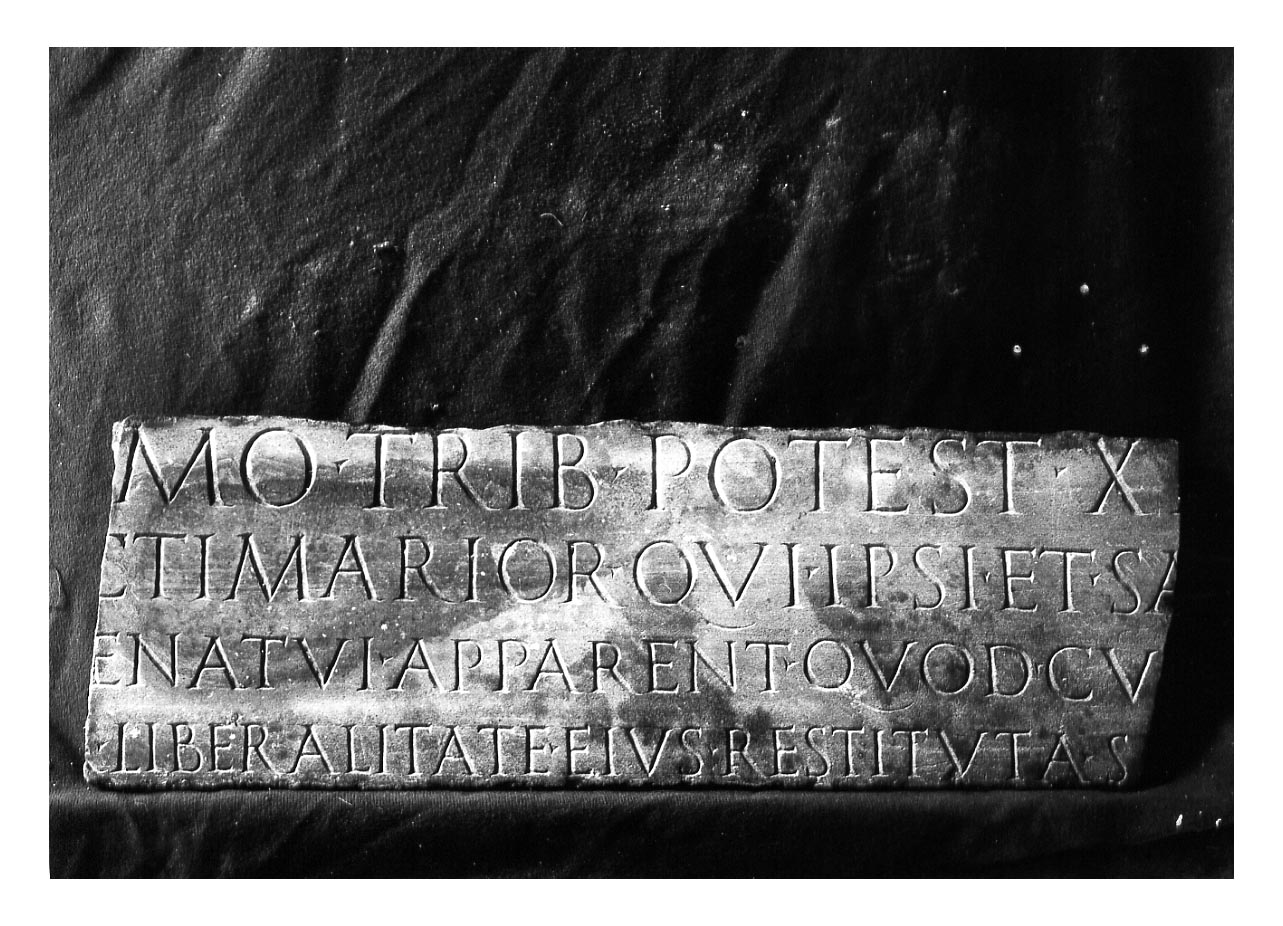 Lastra rettangolare caratterizzata da una faccia incisa con la seguente iscrizione onoraria in lingua latina: [_ _ _] MAXIMO TRIB(VNICIA) POTEST(ATE) XIII CO(N)S(VLI) III P(ATRI) P(ATRIAE) COLLEG(IVM) VICTIMARIOR(VM) QVI IPSI ET SACERDOTIBVS ET MAGIST(RIS) ET SENATVI APPARENT QVOD CVM COMMODIS EORVM IMPVGNARETVR LIBERALITATE EIVS RESTITVTA SINT DEDIC(AVIT) VI K(ALENDAS) MAIAS. Il testo è articolato, per quanto è conservato, su quattro linee, distribuite secondo l'asse mediano. Le lettere sono rese in modo regolare. E' impiegata interpunzione a triangoletto apicato