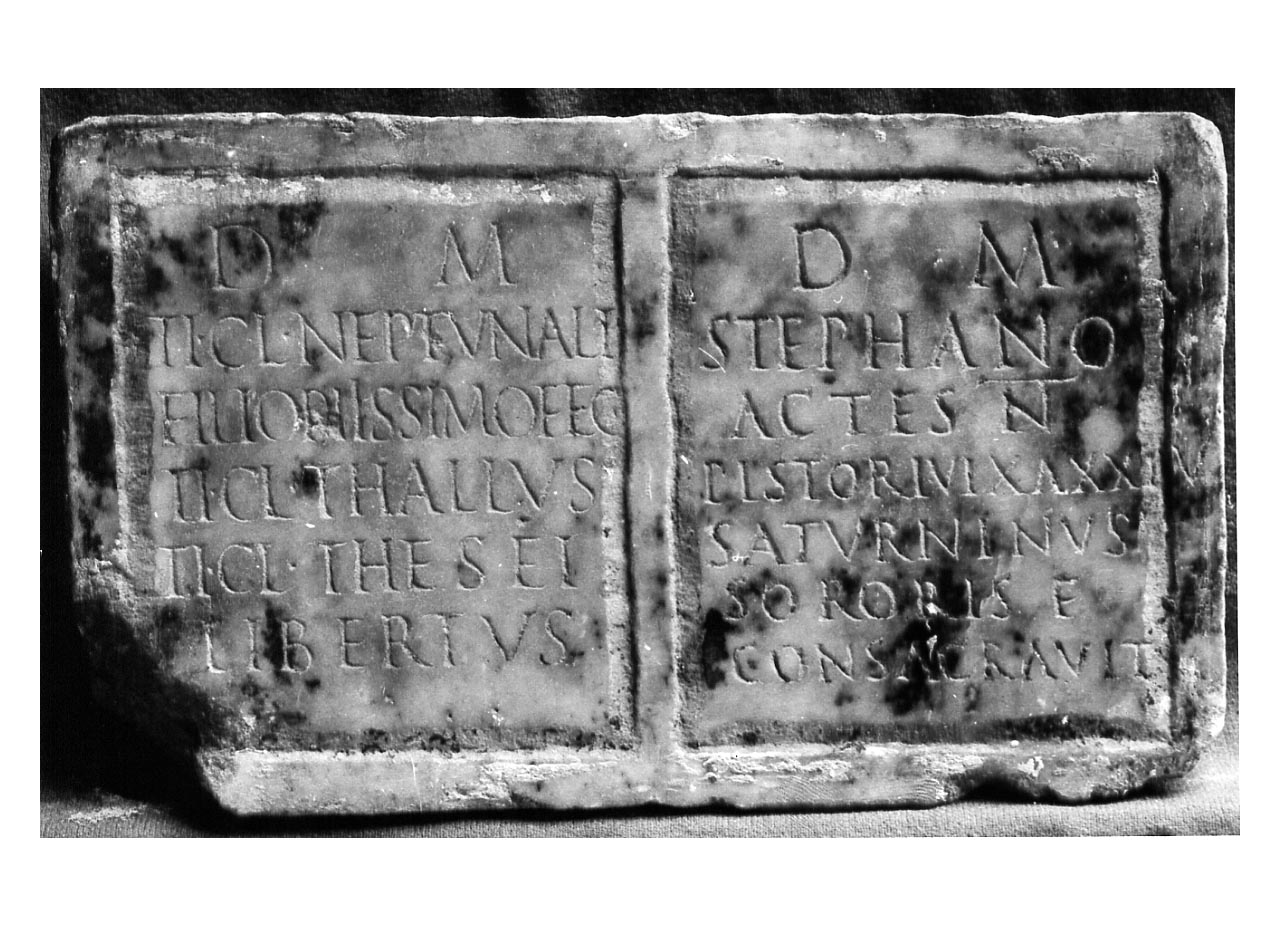 - ISCRIZIONI faccia anteriore della lastra - a sinistra, D M | TI CL NEPTVNALI | FILIO PIISSIMO FEC | TI CL THALLVS | TI CL THESEI | LIBERTVS; a destra, D M | STEPHANO | ACTES N | PISTORI VIX A XXIV | SATVRNINVS | SORORIS F | CONSACRAVIT - lettere capitali - a incisione - latino