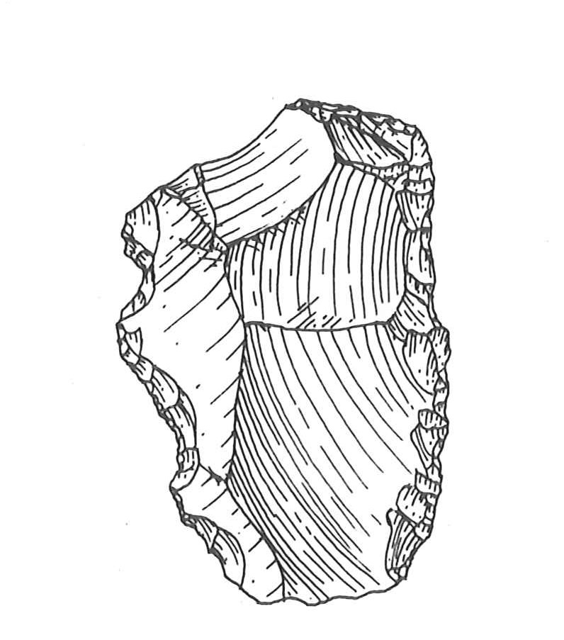 Raschiatoio su scheggia laminare molto piatta di colore crema. Il raschiatoio presenta un ritocco semplice profondo diretto bilaterale: con delineazione denticolata sul margine sinistro e lineare su quello destro; un ritocco parziale semplice profondo inverso è presente sul margine trasversale distale. Tallone liscio