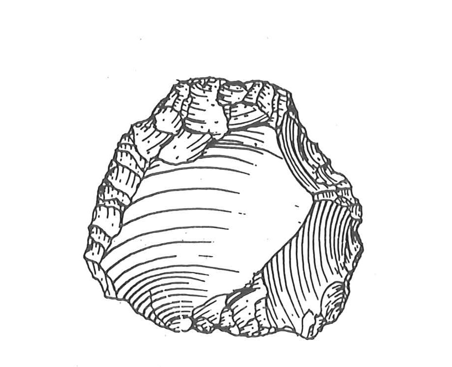 Nucleo discoidale di colore marrone. Il nucleo presenta distacchi di preparazione orientati centripetamente