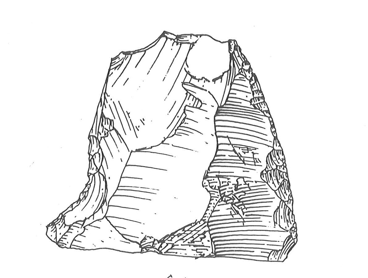 Frammento di raschiatoio su supporto molto piatto di colore rosato. Il ritocco, laterale destro, è semplice profondo diretto (tendente al piatto)
