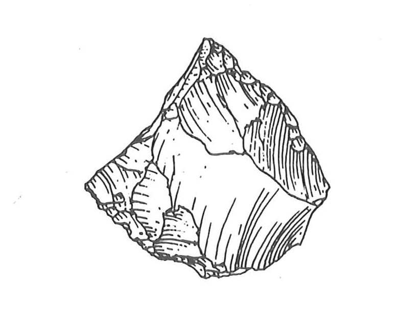 Frammento di raschiatoio su supporto iperpiatto di colore grigio chiaro. Il ritocco, laterale sinistro, è semplice profondo diretto con delineazione sinuosa. Tallone faccettato convesso