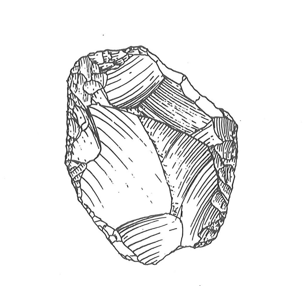 Frammento di raschiatoio su supporto molto piatto di colore grigio chiaro. Il ritocco si presenta: semplice profondo diretto laterale sinistro con delineazione convessa e piatto invadente diretto trasversale distale. Tallone liscio