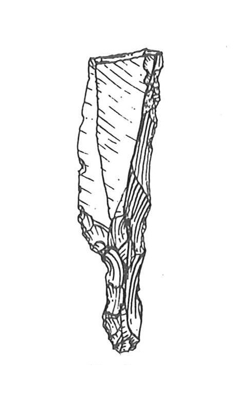 Lama stretta carenata di colore rosso. Il ritocco erto profondo diretto presente nella parte prossimale della lama caratterizza il cran laterale sinistro. Tallone liscio