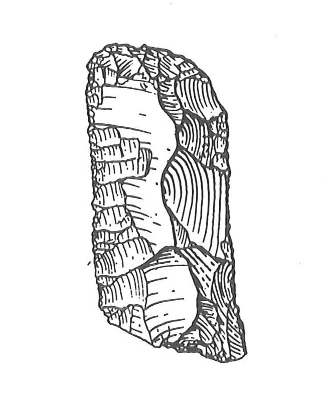 Frammento di grattatoio ottenuto su supporto piatto di colore verde marrone. Il fronte del grattatoio, distale è leggermente obliquo rispetto all'asse dello strumento ed è ottenuto da un ritocco erto profondo diretto in parte asportato da freschi distacchi di piccole schegge. Ii ritocco laterale interessa il margine sinistro che nella parte prossimale e mediana si presenta piatto invadente diretto e nella parte distale semplice marginale
