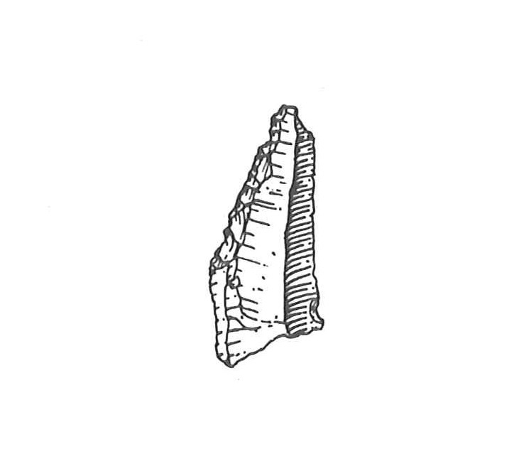 Frammento di punta a dorso ottenuta su lama molto piatta di colore rosa. Lo strumento presenta un ritocco erto profondo diretto sul margine laterale destro e un ritocco complementare prossimale inverso. La delineazione del ritocco diretto ed inverso suggerisce la terminazione a punta