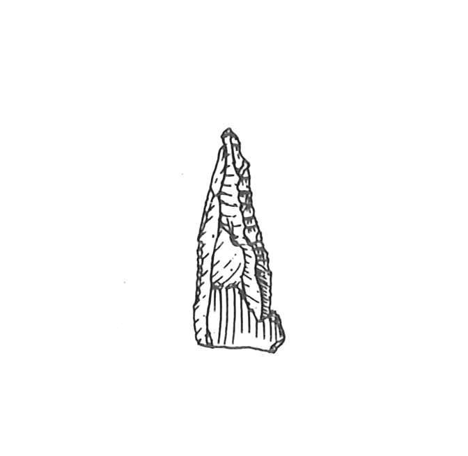 Frammento di punta a dorso ottenuta su supporto piatto di colore rosso. Lo strumento presenta un ritocco erto profondo diretto sul margine laterale destro. La delineazione del ritocco e la lieve frattura distale suggeriscono la terminazione a punta