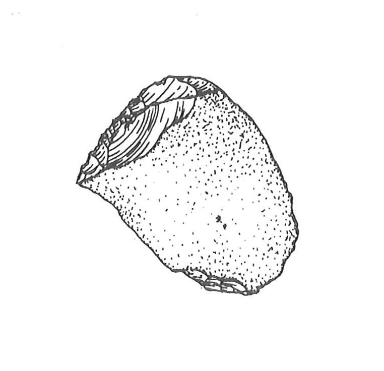 Scheggia a ritocco erto iperpiatta di colore marrone violaceo. La scheggia presenta un ritocco erto profondo diretto parziale sul margine trasversale distale. Il tallone è liscio. La faccia dorsale è quasi interamente interessata dal cortice