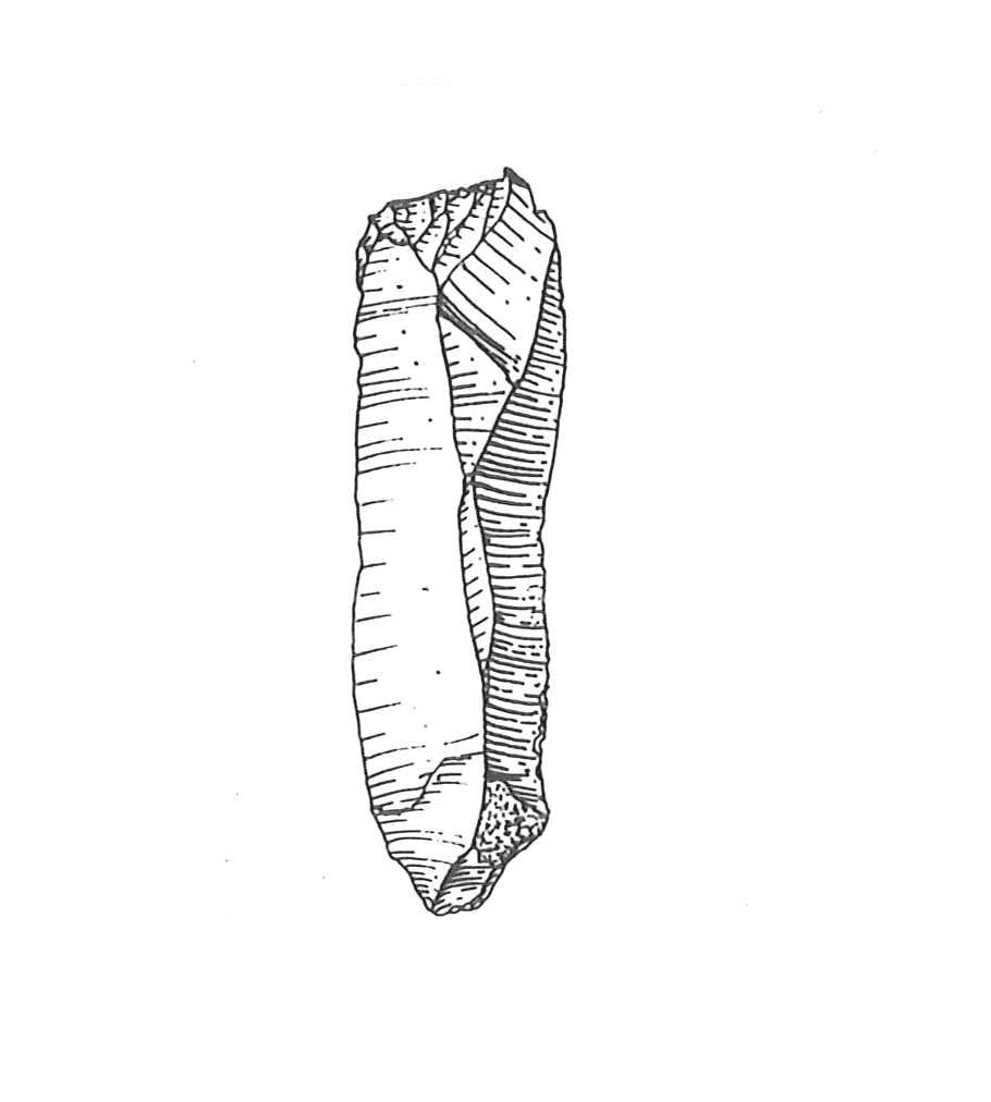 Troncatura ottenuta su lama stretta piatta di colore rosa crema. Il ritocco sul margine trasversale distale piatto invadente diretto caratterizza la troncatura foliata. Tallone puntiforme