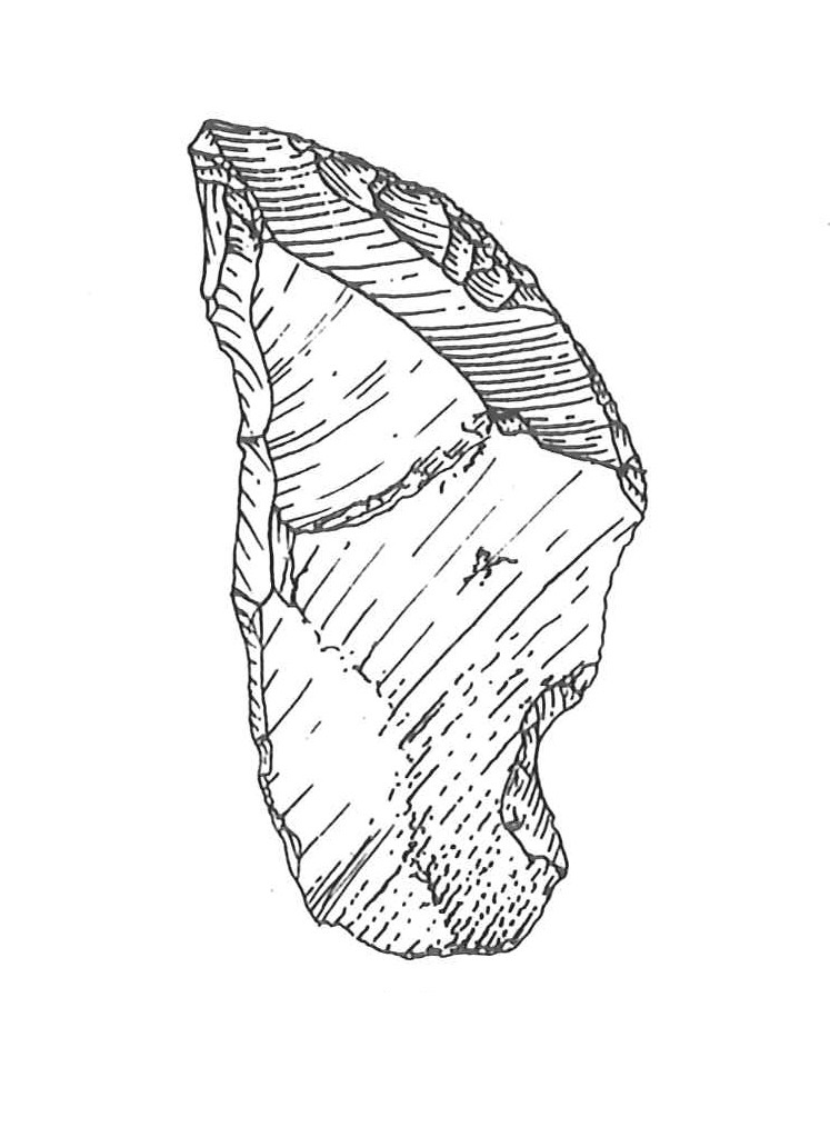 Raschiatoio su scheggia laminare molto piatta di colore rosso chiaro. Il ritocco, semplice profondo diretto (tendente al piatto) è presente sul margine trasversale distale. Tallone liscio concavo