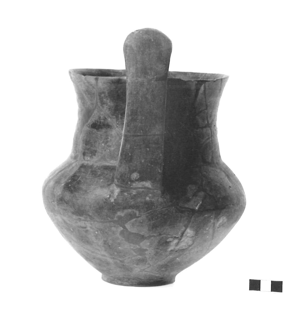 Corpo globulare con alto collo cilindrico a pareti concave. Piede a disco. Anse nastriformi con innesto a rocchetto presso l' orlo