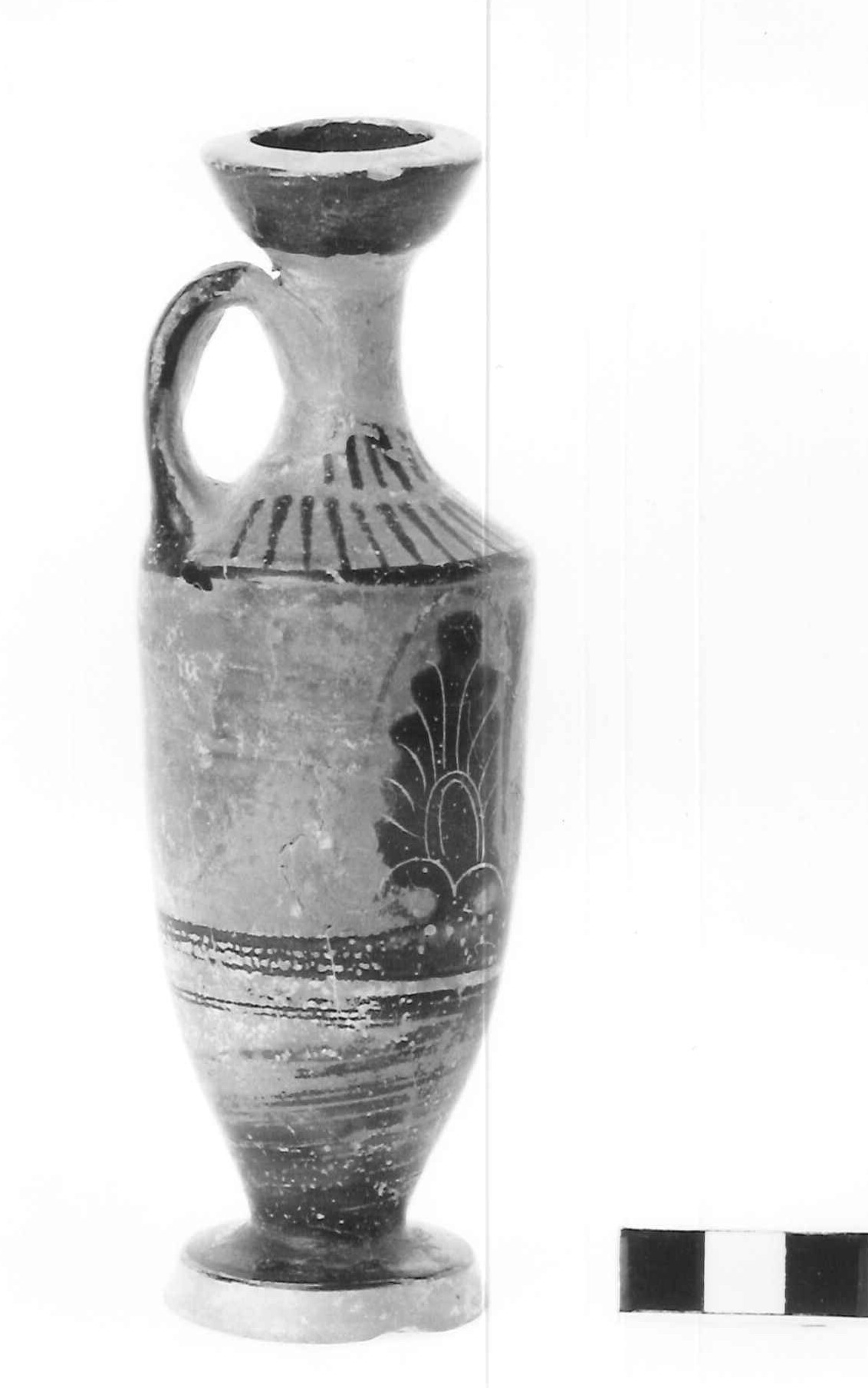 Boccello troncoconico, collo cilindrico a pareti concave, spalla tesa, corpo cilindrico rastremato, piede a disco ingrossato. Ansa verticale nastriforme. Decorazione a vernice nera: ansa, bocchello e parte inferiore del corpo verniciati