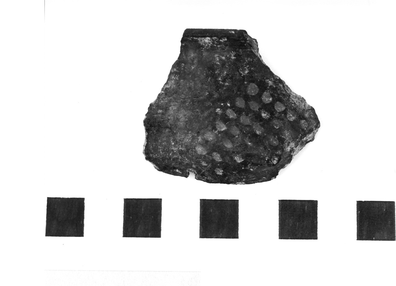 Orlo arrotondato; labbro svasato curvilineo; ventre arrotondato; decorazione con punti collocati a triangolo praticati a punzone; bugna sulla spalla; impasto nerastro