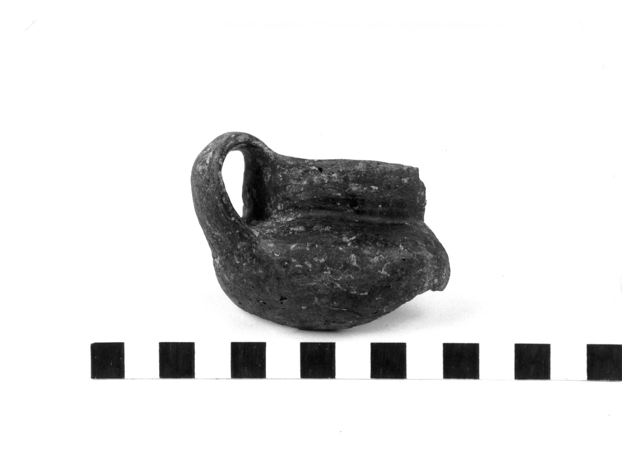 Orlo assottigliato; labbro a colletto; bocca ovale; corpo globulare; ansa a nastro impostata fra orlo e spalla; sul ventre bugnetta ovale; impasto nerastro