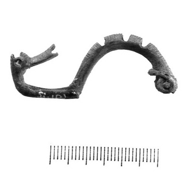 Arco simmetrico con incassi e decorazione incisa a fasci di linee trasversali; molla a balestra; staffa con sezione a J ed estremità ornitomorfa rivolta verso l' arco (testa di anatra)