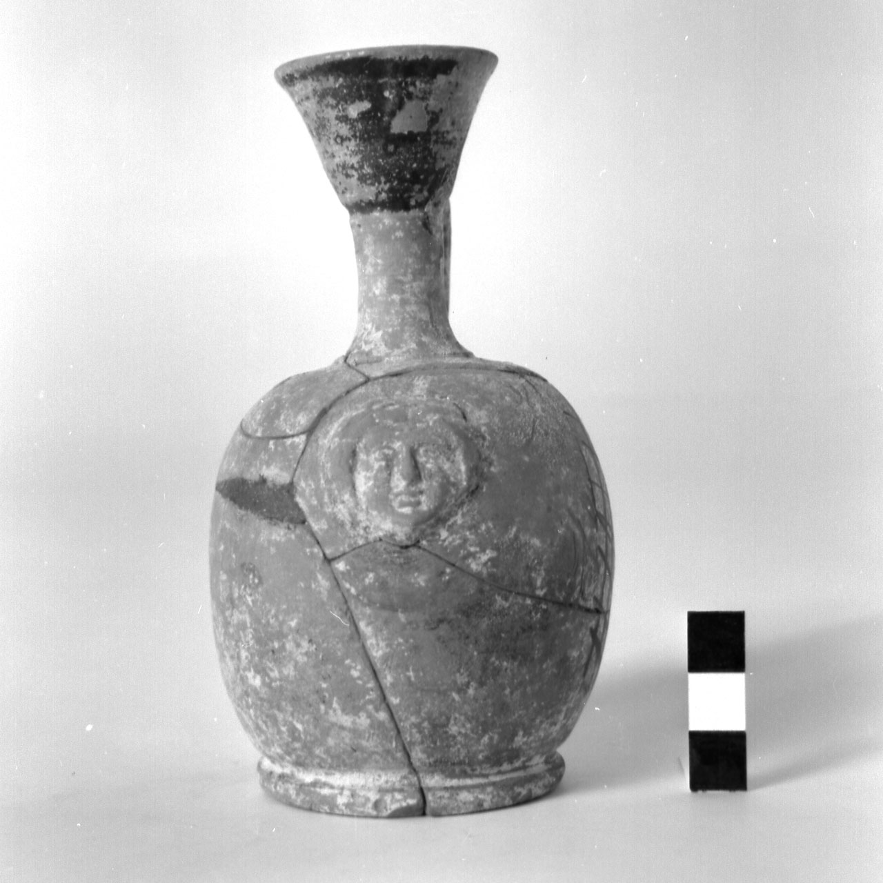 Bocchello imbutiforme su collo cilindrico sottile, distinto dal ventre globulare da lieve modanatura; ansa a nastro ingrossato impostata sul collo e sulla spalla, largo piede ad anello. Verniciati in nero il bocchello e la parte superiore dell'ansa. Decorazione: Ant: testina femminile a rilievo applicato; Post.: motivo a reticolo in vernice nera su fondo ripsarmiato