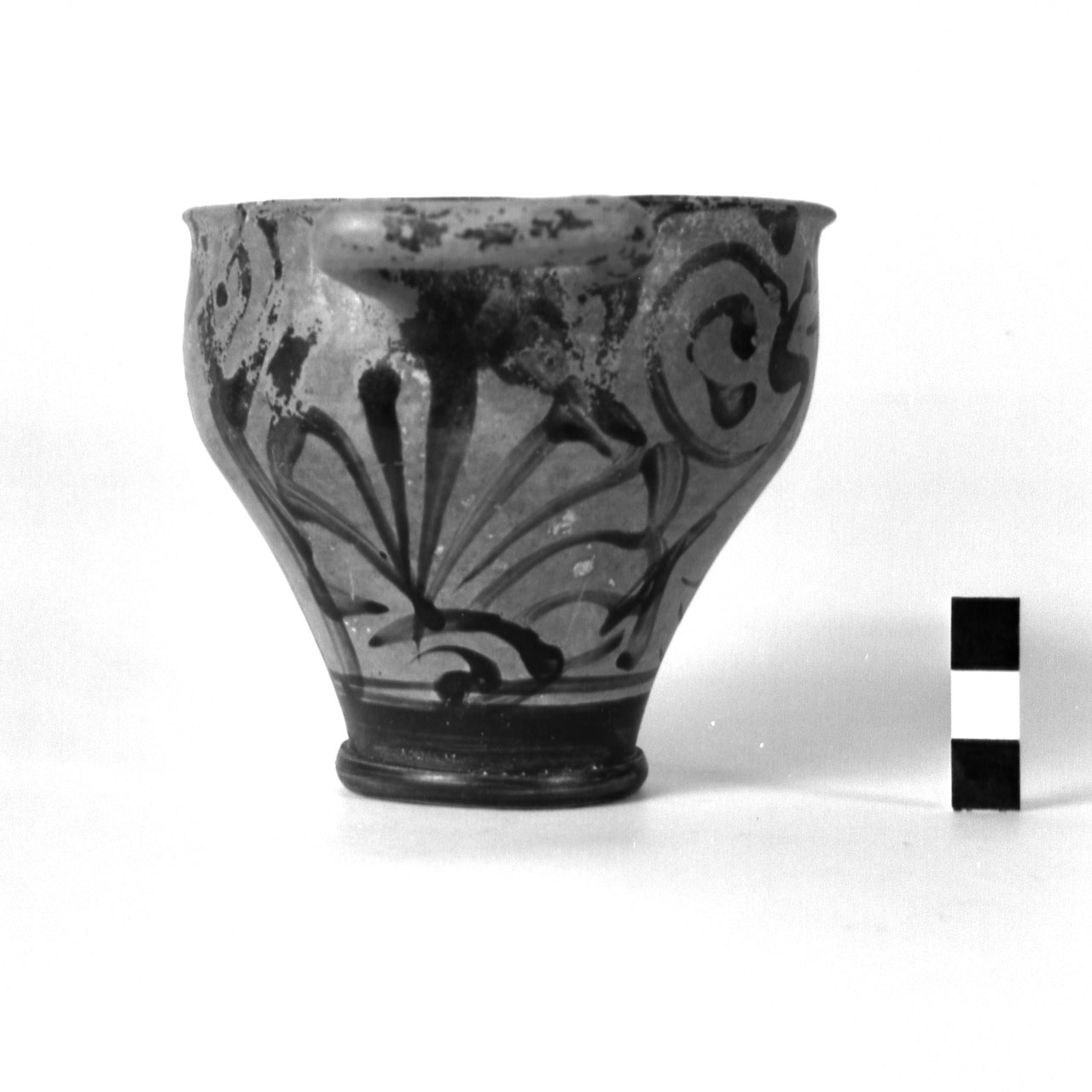 Labbro lievemente estroflesso con orlo arrotondato; vasca con carena arrotondata, fortemente rastremata verso il piede ad anello; anse oblique, a bastoncello, sotto l' orlo