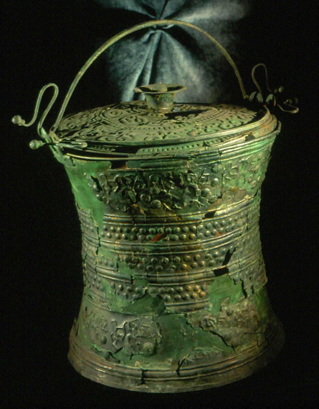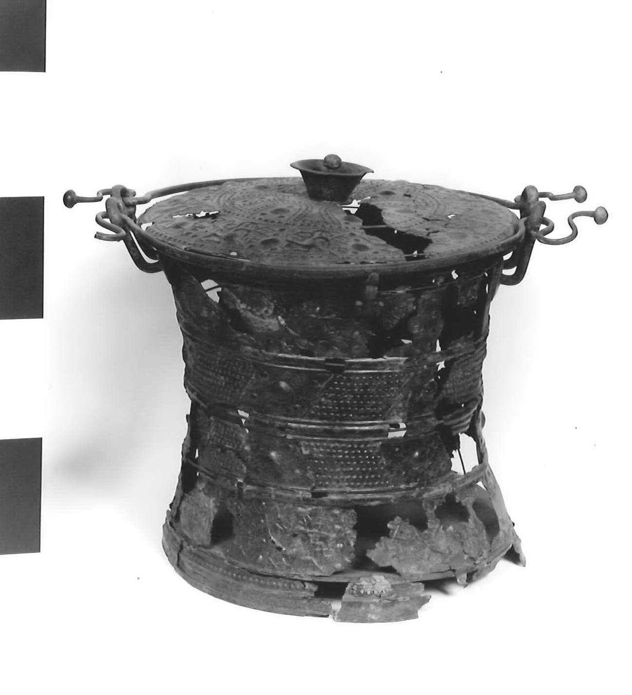 cista dal corpo cilindrico, svasato al centro, formata da un'unica lamina curvata e saldata sul fianco con piccoli bulloni, ripiegata su se stessa all'orlo, formante un breve piede ad anello. Sotto l'orlo sono fissate, c ontrapposte, due lastrine da cui escono due braccetti piegati ad angolo r etto, desinenti ad occhiello, in cui passano le estremità ricurve dei due manici, che terminano a pomello pieno. Nei punti mediani, fra dette lastr ine, sono fissate, sotto l'orlo, due protomi di animale fantastico, con c orpo cilindrico, gambe anteriori alzate, fauci spalancate, grandi orecchi e. Su queste protomi si appoggiano i manici girevoli. Coperchio troncocon ico, con maniglia troncoconica nella quale è inserito un perno, con apice a bottone globulare. Decorazione cista: a sbalzo, divisa in fasce orizzon tali, separate da cordoni; dall'alto: serie di animali, fantastici stiliz zati (cervidi) alternati a borchie e svastiche; due fasce spartite in rom bi decorati, alternativamente, con fit