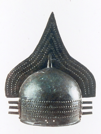 a cresta, costituito da due lamine di bronzo. Calotta emisferica. Alla base della cresta, su entrambi i lati e fissati alla calotta mediante quattro chiodi, due lamine rettangolari da cui sporgono tre elementi cilindrici, appiattiti alle estremità, disposti orizzontalmente uno sopra l'altro. Visibili alla base della calotta, su ogni lato, due fori circolari ( su un lato è presente anche un terzo foro più piccolo) per il fissaggio delle paragnatidi. Tesa leggermente svasata. La cresta è decorata sui due lati, nella zona mediana, da tre file di borchiette limitate da linee di puntini. La calotta presenta su entrambi i lati, nella zona mediana, protomi ornitomorfe rese mediante file di puntini, di cui una centrale rivolta a sinistra e due coppie laterali divergenti. La zona inferiore è decorata con serie orizzontali e verticali di fasce con borchiette limitate da file di puntini