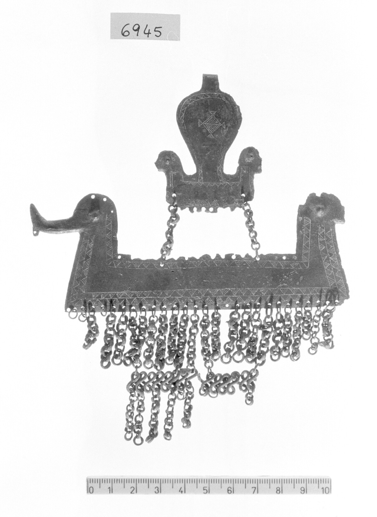 a doppia piastrina trapezoidale con protomi ornitomorfe laterali. Al centro della piastrina superiore si imposta una lamina discoidale allungata nella parte inferiore e desinente in quella posteriore, a occhiello. Le due piastrine sono collegate da due catenelle mediante fori circolari. Alla base della piastrina inferiore sono collegate, mediante fori, ventidue catenelle disposte verticalmente, che si innestano su una treccia di filo di bronzo posta di traverso. Una seconda fila di sei catenelle è fissata al di sotto della treccia. Decorazione incisa costituita da file di triangoli lisci e campiti da tratti obliqui inquadrate da linee (bordi piastrine); rombo con diagonali incise e quattro triangoli con apici volti verso i vertici campiti con linee incise parallele