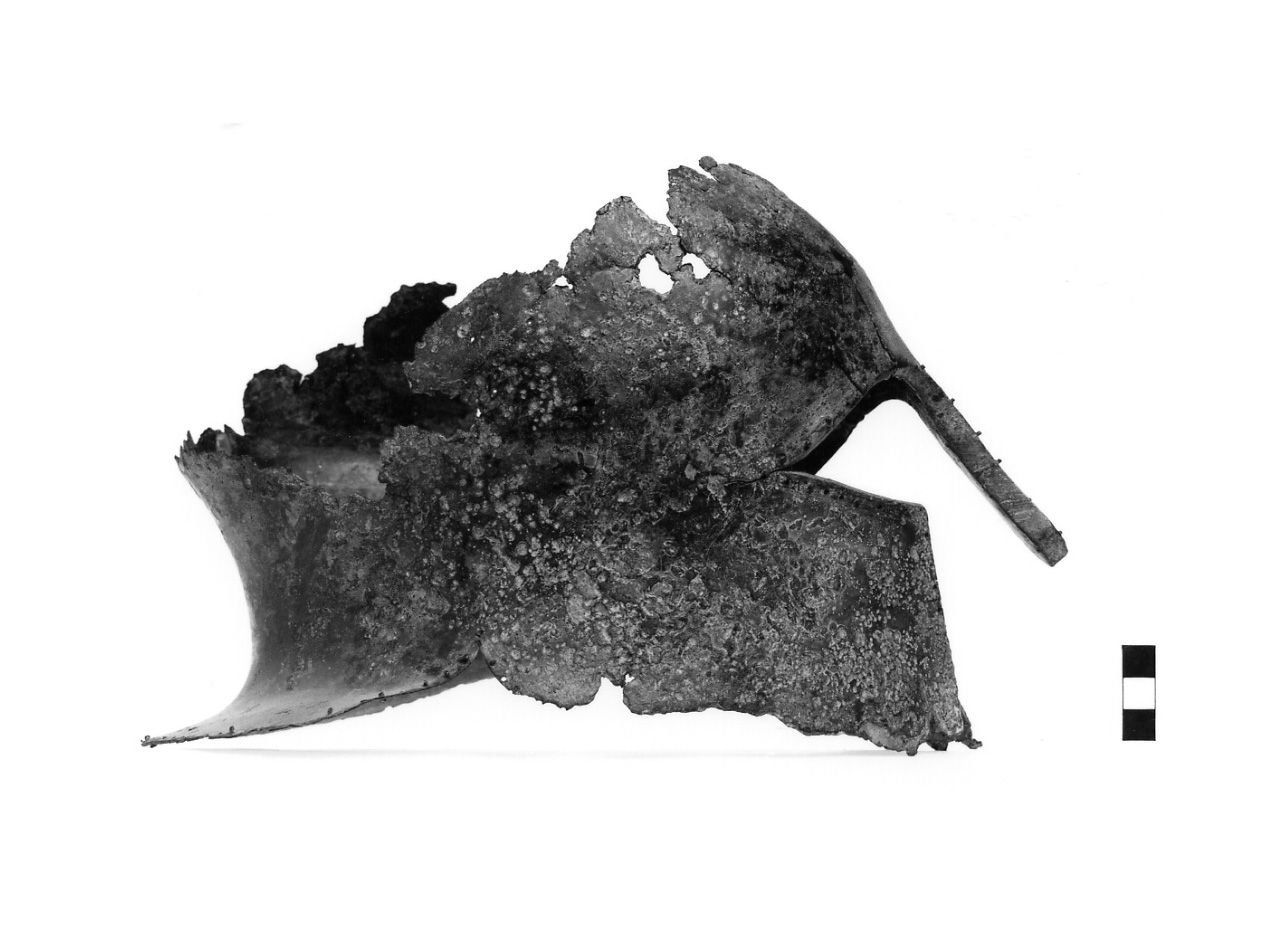 lungo i bordi serie continua di forellini con ribattini per il fissaggio del rivestimento interno; in corrispondenza dell'arcata superiore destra restauro antico costituito da una fascetta di lamina rettangolare, fissata da quattro chiodini