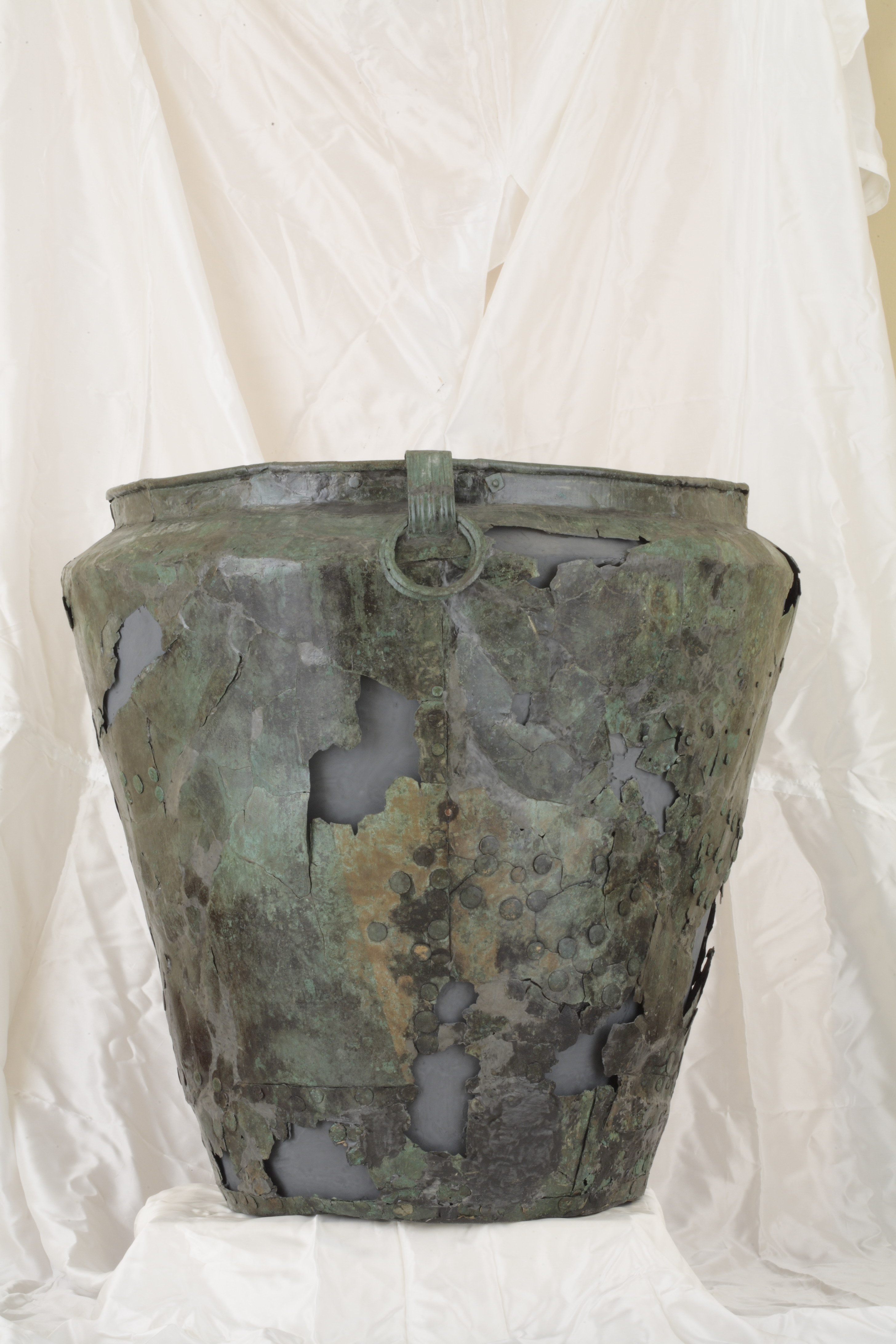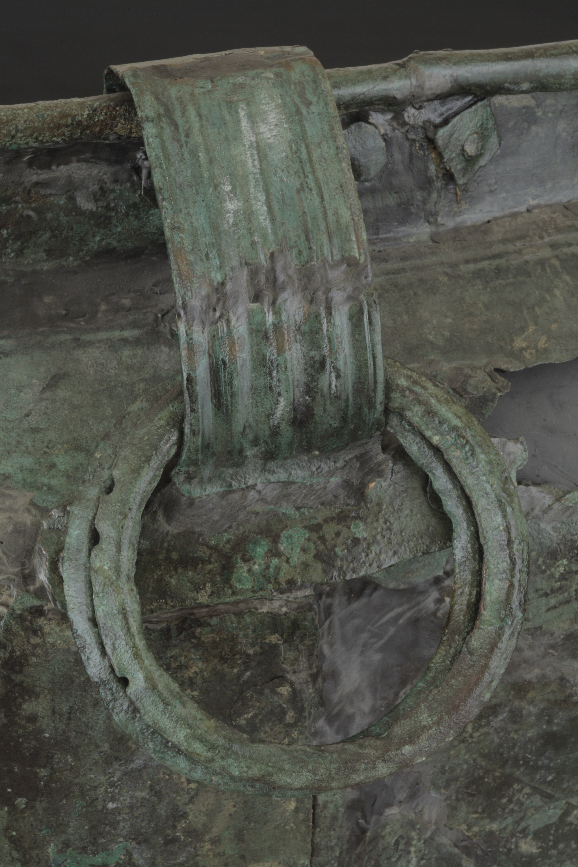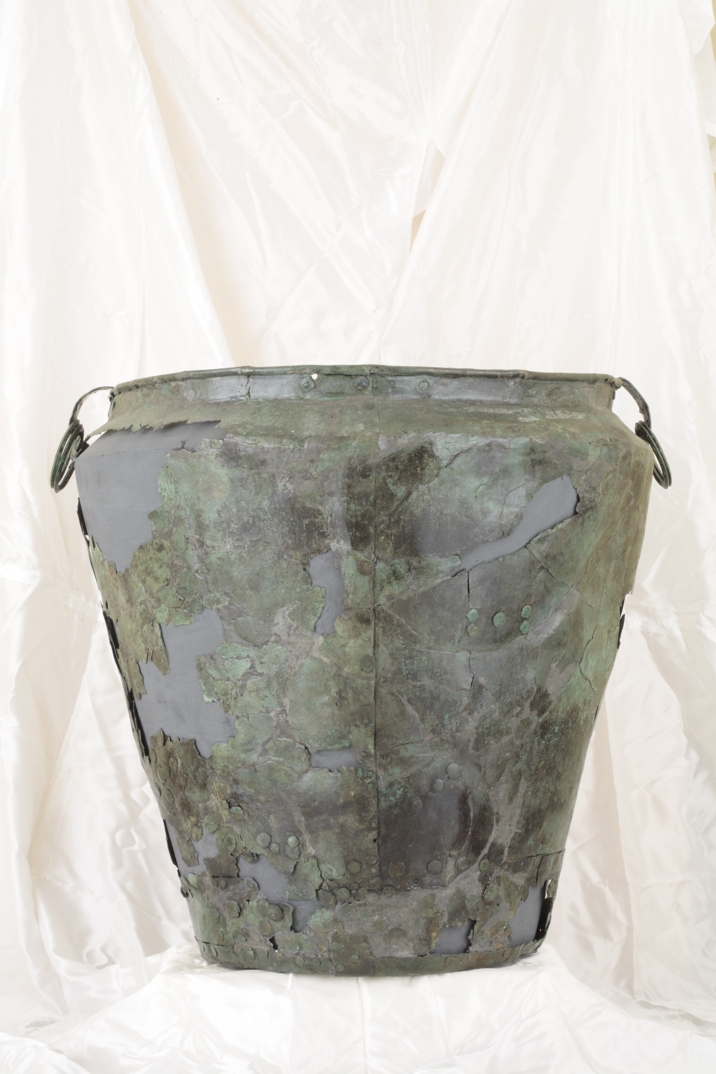 Basso collarino arrotondato impostato su brevissima spalla con ampio corpo troncoconico, composto da lamine congiunte ed imbullettate: Anse verticali a nastro, con faccia esterna a multiple costolature, impostate ad anello alla base della spalla e sulla parete interna dell'orlo, mediante attacchi a piastrina regolare imbullettati. Coppia di anelli di bronzo a sezione lenticolare inserita in ciascuna ansa. Originario della Cultura dei Campi d'Urne, questo caratteristico recipiente è stato ripreso e prodotto in varie culture dell'Italia antica di facies orientalizzante, in primo luogo in ambito etrusco