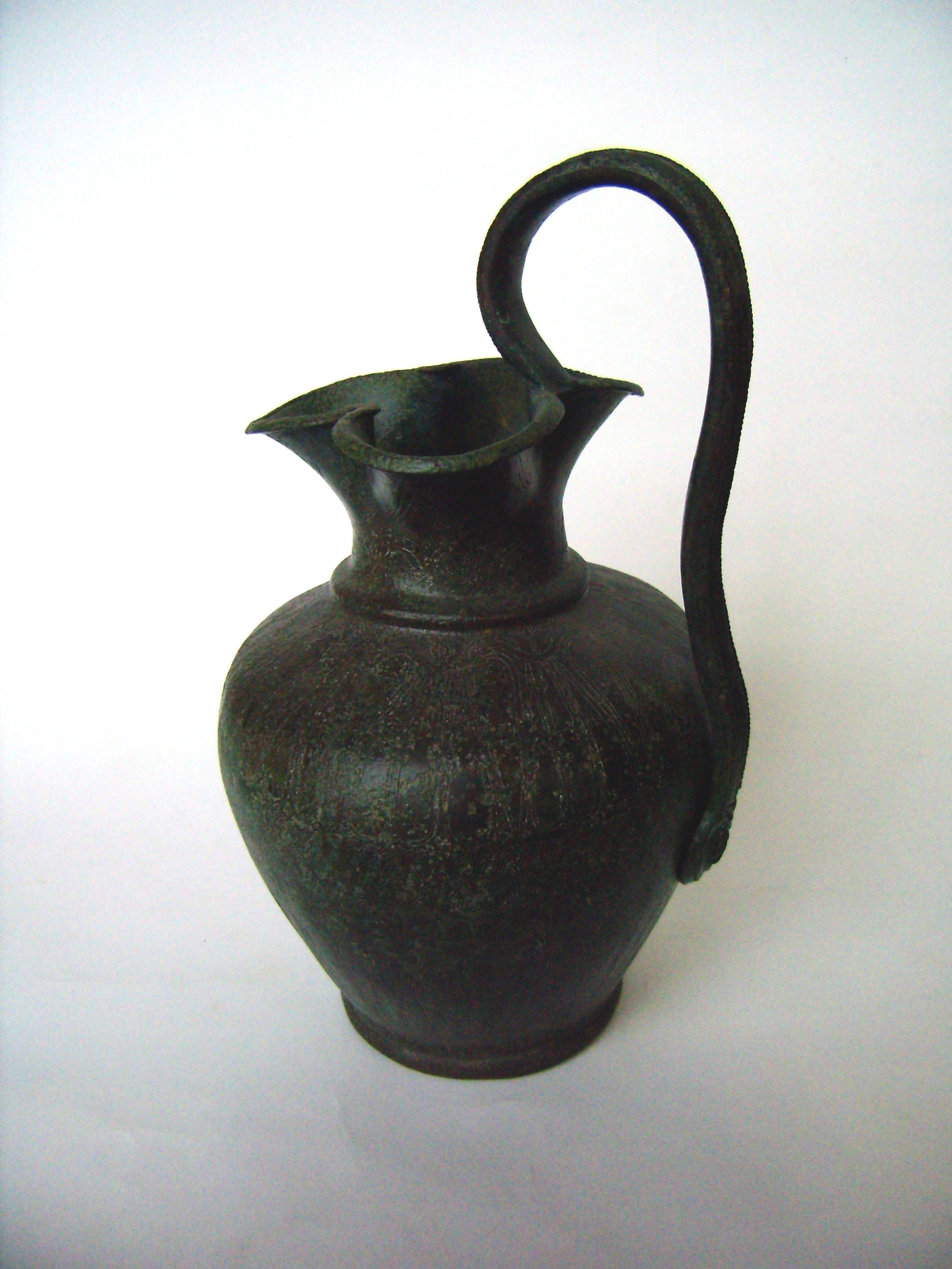 ampia spalla arrotondata, ventre rastremato; basso collo cilindrico con risega alla base; ansa a bastoncello con andamento sinuoso; decorazione incisa su gran parte del corpo del vaso e dell’ansa