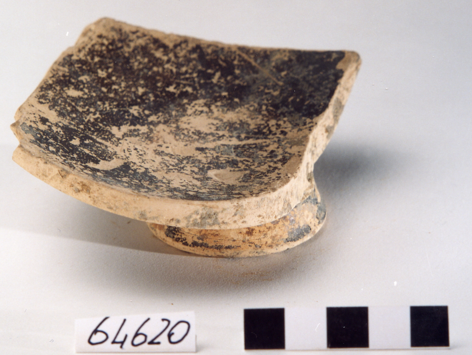 Scodella a vernice nera malcotta, con tracce delle dita del vasaio intorno al piede. Il piede è ad anello piccolo e svasato