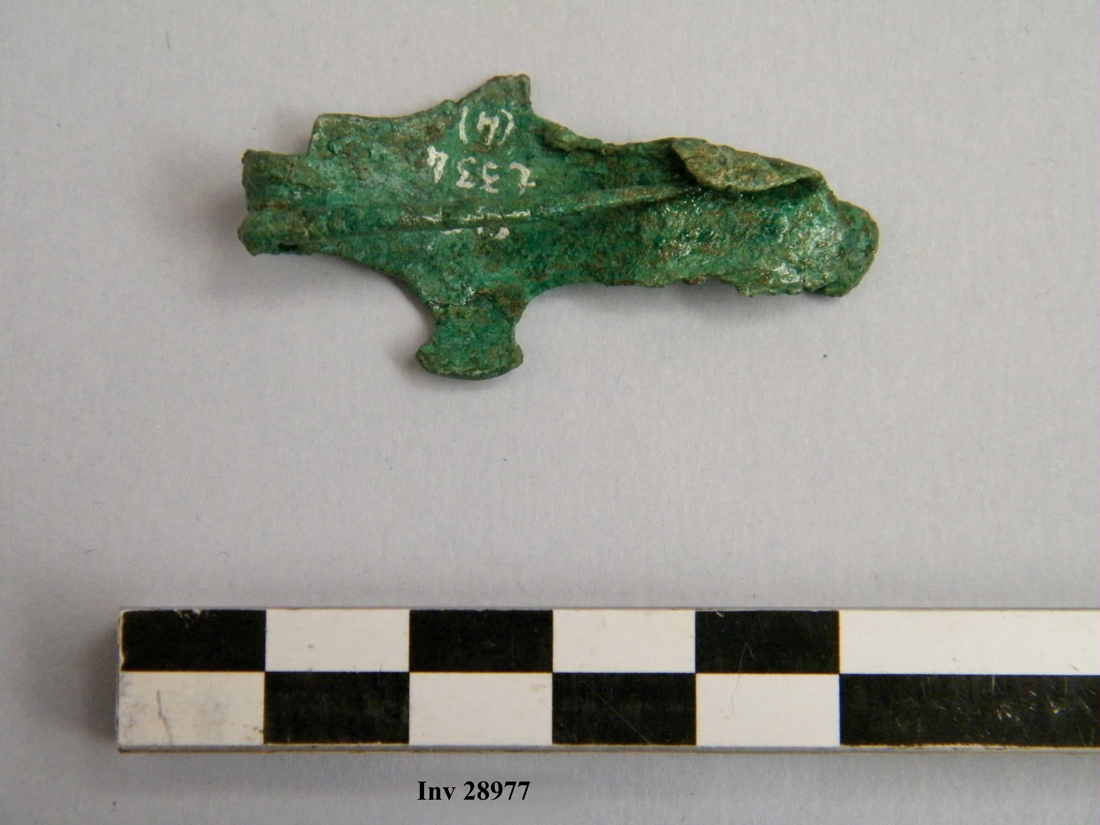 Arco in lamina di bronzo, a forma romboidale, decorato, nel punto di massima espansione, con due bottoni rastremati alla base. L'arco è allargato alla sommità e rastremato ai lati, soprattutto verso la molla a doppio avvolgimento dove si restringe a formare una semplice verga, staffa con sezione a C con la parte superiore appiattita e molto allungata, decorata all'estremità con un bottone rastremato alla base