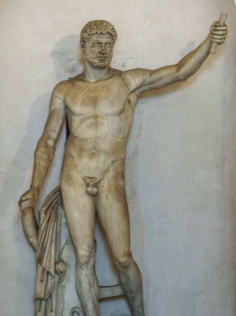 - NOTIZIE STORICO CRITICHE La testa, le braccia e parte del sostegno afferiscono a restauri del XVII sec. afferenti a Niccolò Menghini, il quale avrebbe scelto arbitrariamente per il volto quello dell'imperatore Adriano e inserito nella mano destra il bastone di comando. Lo schema compositivo della statua ricorda motivi policletei pur discostandosi dal canone, ad esempio del "Diadumeno", per alcuni evidenti particolari, come il forte scarto della gamba sinistra e le larghe proporzioni del torso. Si tratta probabilmente di una delle statue costuite su schemi policletei in tempi imperiali per essere utilizzate come statue iconiche (cfr. E. Paribeni, Il museo nazionale romano, Sculture Greche del V secolo, Roma 1953, n° 56, con ritmo inverso delle braccia). Il breve tratto di spalla conservato può far escludere che la posizione originale del braccio sinistro fosse diversa dall'attuale, con movimento analogo a quella degli atleti che si incoronano (cfr. H.K. Susserott, Griechische Plastik der IV Jahr, Frankfürt 1938, pag. 171, tav. 23, con identica disposizione delle braccia e delle gambe, simmetrica rispetto a quella delle raffigurazioni più comuni)