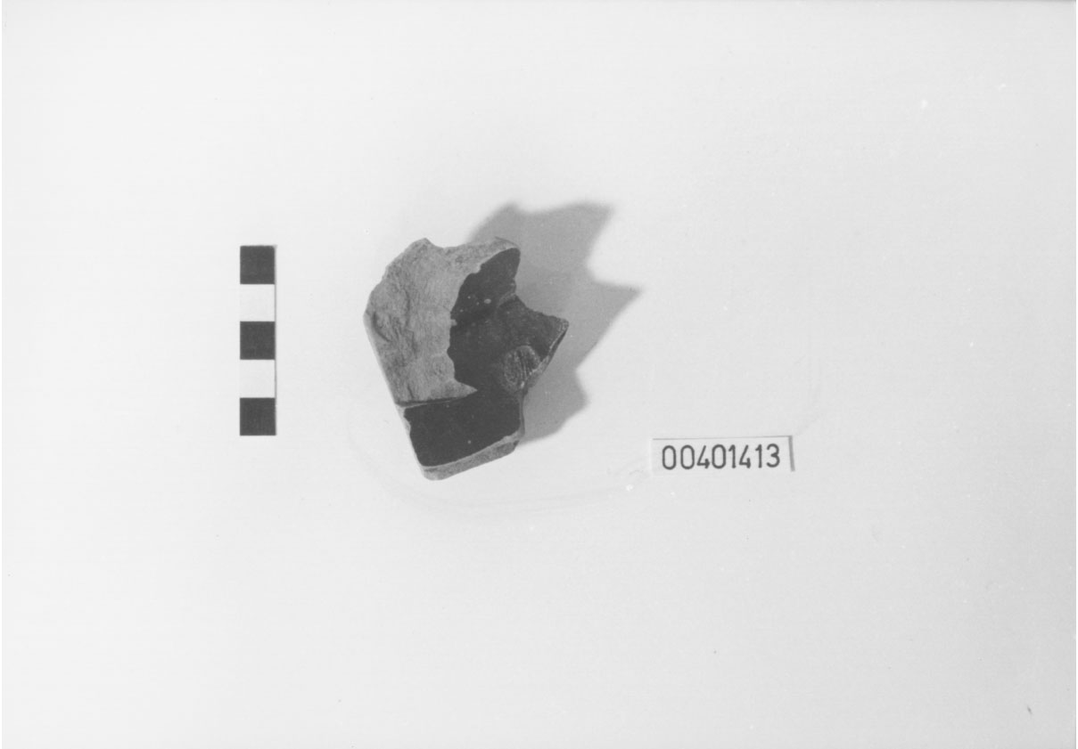 Frammento di scodella in argilla beige a tornio, vernice nero-verdognola. Fondo esterno non verniciato, conico, piede a facce quasi rettilinee, obliquo, colature di vernice