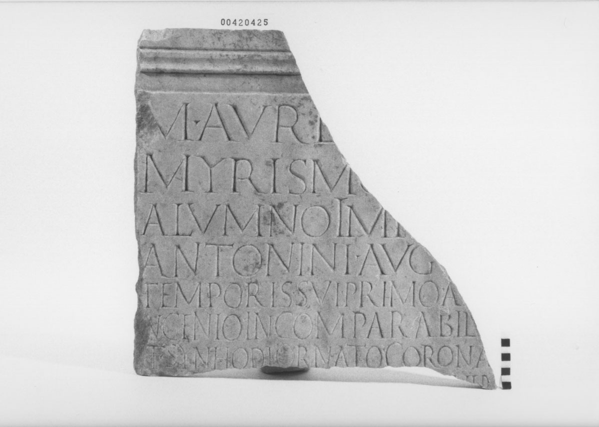 - ISCRIZIONI M. Aure[- - -]/ Myrism[- - -]/ Alumno imp[- - -]/ AntoniniAug[- - -]/ temoris sui primo a[- - -]/ [i]ngenio incomparabil[- - -]/ [.]i synodi ornat corona[- - -]/ [- - -] - lettere capitali - a solchi - latino