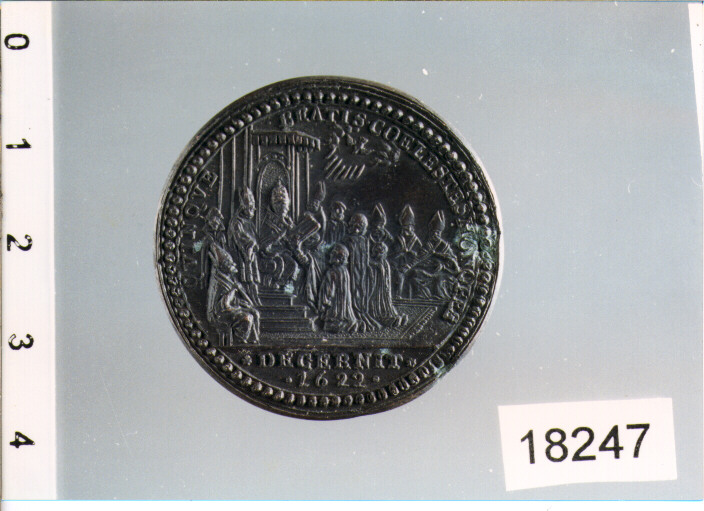 D/ GREGORIVS . XV . PONT . MAX . A . III ., BUSTO A D.; SOTTO . 1623 .; R/ QVINQVE . BEATIS . COELESTES . HONORES, PONTEFICE IN TRONO; IN ESERGO DECERNIT / 1622