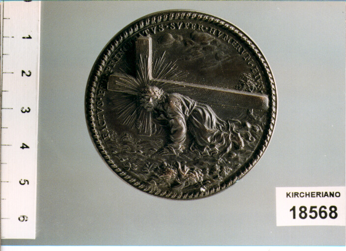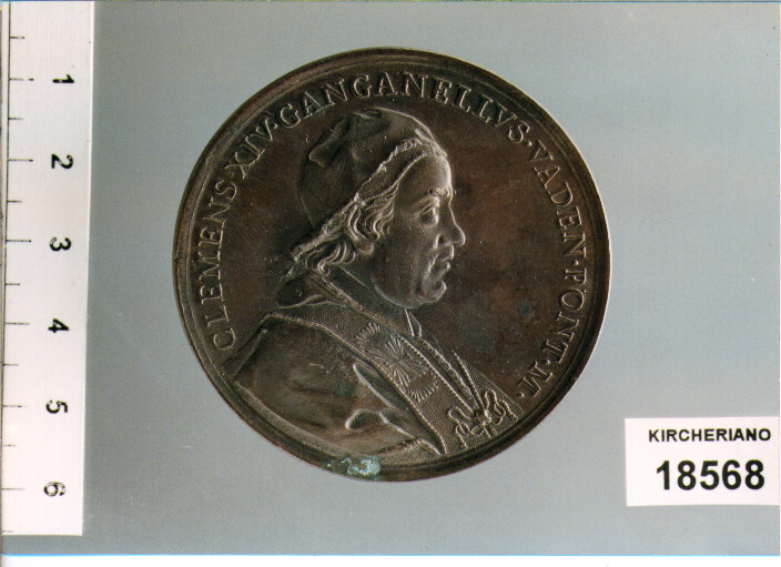 D/ CLEMENS . XIV . GANGANELLVS . VADEN . PONT . M . BUSTO A D. CON CAMAURO, MOZZETTA E STOLA; NEL TAGLIO F. CROPANESE .; R/ FACTVS . EST . PRINCIPATVS . SVPER . HVMERVM . EIVS, CRISTO CADE SOTTO LA CROCE
