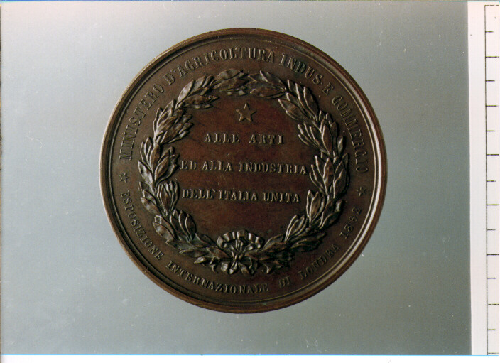 D/ VITTORIO EMANUELE II RE D'ITALIA TESTA A S.; SOTTO G . FERRARIS; R/ MINISTERO D'AGRICOLTURA INDUS . E COMMERCIO; ESPOSIZIONE INTERNAZIONALE DI LONDRA 1862 . ENTRO CORONA DI ALLORO, ALLE ARTI / ED ALLA INDUSTRIA / DELL'ITALIA UNITA