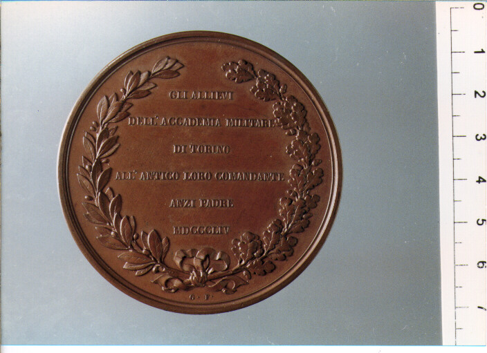 D/ CESARE SALUZZO, BUSTO DI 3/4 A D.; SOTTO G. FERRARIS FECE;R/ GLI ALLIEVI / DELL'ACCADEMIA MILITARE / DI TORINO / ALL'ANTICO LORO COMANDANTE / ANZI PADRE / MDCCCLIV; ENTRO CORONA DI QUERCIA E ALLORO; SOTTO G. F