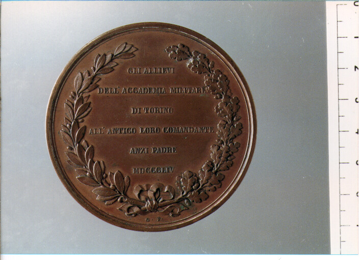 D/ CESARE SALUZZO, BUSTO DI 3/4 A D.; SOTTO G. FERRARIS FECE; R/ GLI ALLIEVI / DELL'ACCADEMIA MILITARE / DI TORINO / ALL'ANTICO LORO COMANDANTE / ANZI PADRE / MDCCCLIV; ENTRO CORONA DI QUERCIA E ALLORO; SOTTO G. F