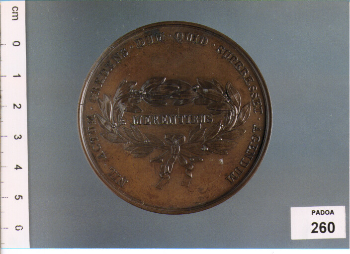 D/ NIL.ACTUM.CREDENS.DUM.QUID.SUPER ESSET.AGENDUM; MERENTIBUS, ENTRO CORONA DI ALLORO; R/ ET.VETERES.REVOCAVIT.ARTES, FIGURA DI GIOVANE ALATO CON TAVOLOZZA; IN ESERGO ACADEMIA.LIGUSTICA/MDCCLVIII; SOTTO H. VASSALLO F