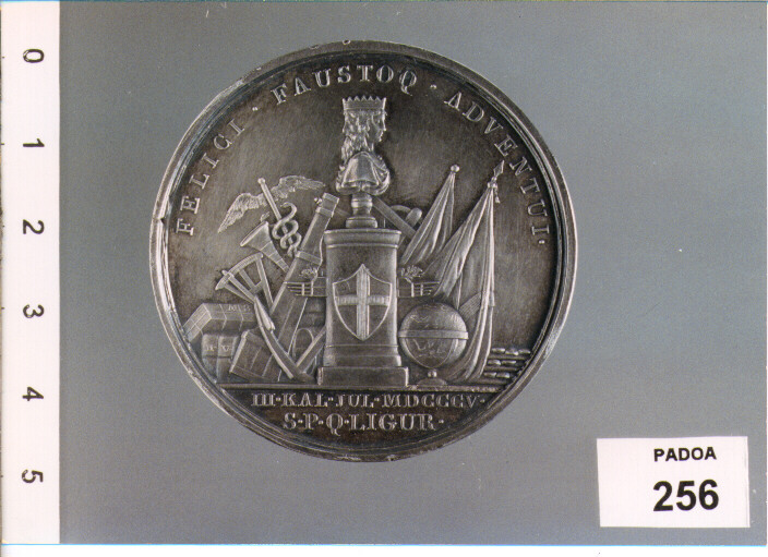 D/ IMP. NAPOLEON . P . F. A . REX . ITAL ., BUSTO LAUREATO A D.; SOTTO H . VASSALLO . F .; R/ FELICI . FAUSTO Q . ADVENTUI ., EMBLEMI; IN ESERGO III . KAL . JUL . MDCCCV . / S . P . Q . LIGUR