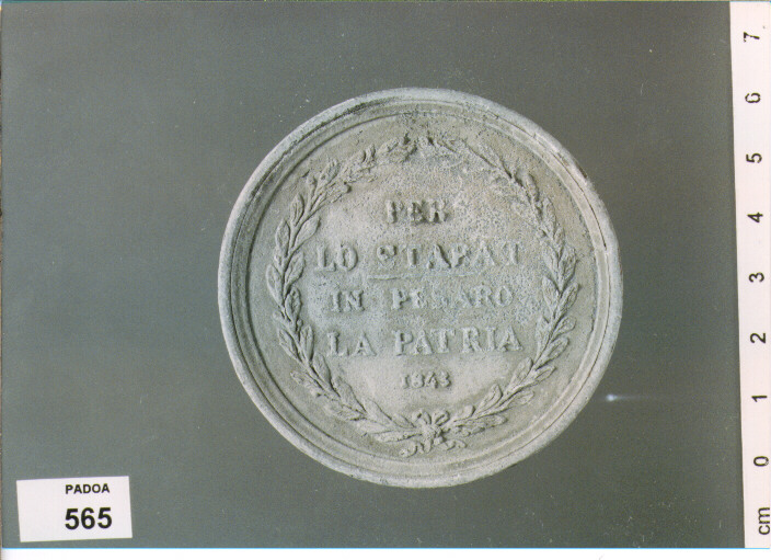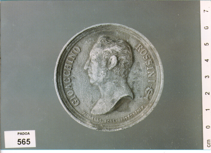D/ GIOACCHINO ROSSINI, TESTA A S.; SOTTO PICCIOLI SCVL . GROTTOLINI F.; R/ PER/ LO STABAT / IN PESARO / LA PATRIA / 1843, ENTRO CORONA DI ALLORO