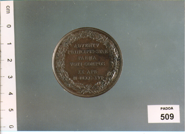 D/ M. LVDOV . ARCH . AVSTR . D . G . PARM . PLAC . ET . VAST . DVX ., TESTA A D.; SOTTO SANTARELLI . F .; R/ ADVENTV / PRINCIPIS . SVAE / PARMA / VOTI . COMPOS / XX . APR . / M.DCCC.XVI., ENTRO CORONA DI QUERCIA