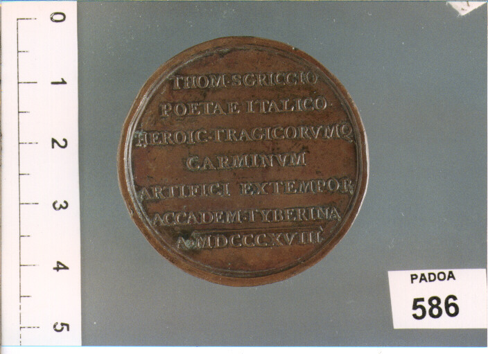 D/ THOM . SGRICCIO / POETAE ITALICO / HEROIC . TRAGICORVMQ./ CARMINVM/ ARTIFICI EXTEMPOR ./ ACCADEM.TYBERINA/A.MDCCCXVIII.; R/ ALTERIVS SIC ALTERA POSCIT OPEM, FIGURA DEL TEVERE SDRAIATO; IN ESERGO T. MERCANDETTI I