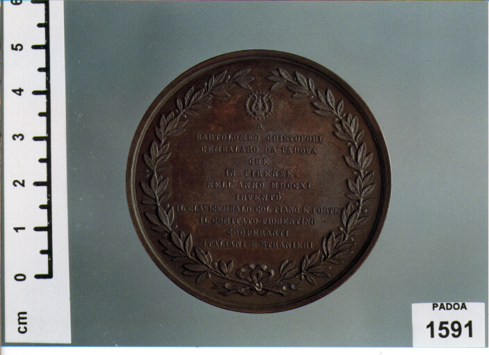 D/ CONFORTA LA MEMORIA MIA CHE GIACE, SCOPERTA DELLA LAPIDE; IN ESERGO, MDCCCLXXVI; R/ A/ BARTOLOMEO CRISTOFORI/ CEMBALARO DA PADOVA/ CHE/ IN FIRENZE/ NELL'ANNO MDCCXI/ INVENTO'/ IL CLAVICEMBALO COL PIANO E FORTE/ IL COMITATO FIORENTINO/..
