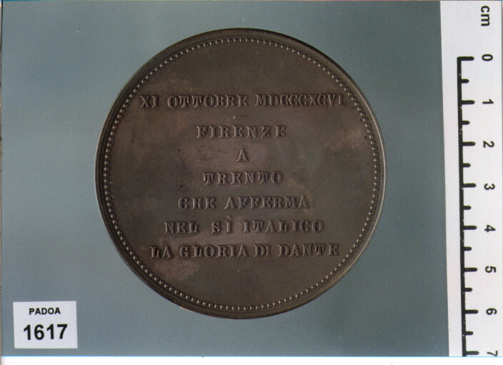 D/ DANTE ALIGHIERI, BUSTO LAUREATO A S. ; SOTTO, L. GIORGI F. ; R/ XI OTTOBRE MDCCCXCVI/ FIRENZE/ A/ TRENTO/ CHE AFFERMA/ NEL SI' ITALICO/ LA GLORIA DI DANTE