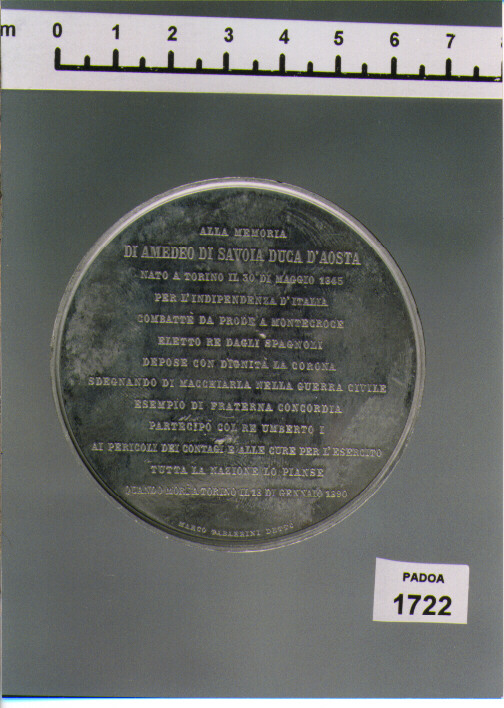 D/ BUSTO DI TRE QUARTI A D. ; SUL TAGLIO, GIOV. VAGNETTI FECE IN ROMA 1890; R/ ALLA MEMORIA/ DI AMEDEO DI SAVOIA DUCA D'AOSTA/ NATO A TORINO IL 30 DI MAGGIO 1845/PER L'INDIPENDENZA D'ITALIA/COMBATTE' DA PRODE A MONTECROCE/ELETTO RE DAGLI SPAGNOLI/..