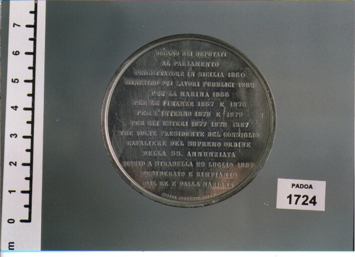 D/ AGOSTINO DEPRETIS, BUSTO A D. ; SOTTO, GIOV. VAGNETTI FECE IN ROMA NEL1884; R/ DECANO DEI DEPUTATI/ AL PARLAMENTO/ PRODITTATORE IN SICILIA 1860/ MINISTRO PEI LAVORI PUBBLICI 1862/ PER LA MARINA 1866/ PER LE FINANZE 1867 E 1876/ ..