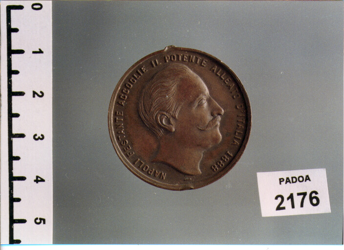D/ 16 OTT. 88- VISITO' LA SUA NAPOLI INSIEME A GUGLIELMO II, TESTA A D. ;SOTTO, OLIVIERI; R/ NAPOLI FESTANTE ACCOGLIE IL POTENTE ALLEATO D' ITALIA1888, TESTA A D