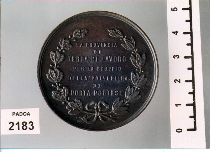 D/ FIGURA FEMMINILE SEDUTA SCRIVE SU UNA LASTRA; IN ESERGO, DI SALVATORE-OLIVIERI F. ; R/ LA PROVINCIA/ DI/ TERRA DI LAVORO/ PER LO SCOPPIO/ DELLAPOLVERIERA/ DI/ PORTA PORTESE, ENTRO CORONA DI QUERCIA E ALLORO