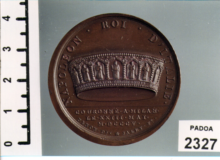 D/ NAPOLEON EMPEREUR, TESTA LAUREATA A D. ; SOTTO, DENON DIR. / ANDRIEU. F. ; R/ NAPOLEON. ROI. D' ITALIE, CORONA FERREA; IN ESERGO, COURONNE' . A.MILAN/ LE. XXIII. MAI. / M. DCCCV. ; SOTTO, DENON D.T. JALEY F.T
