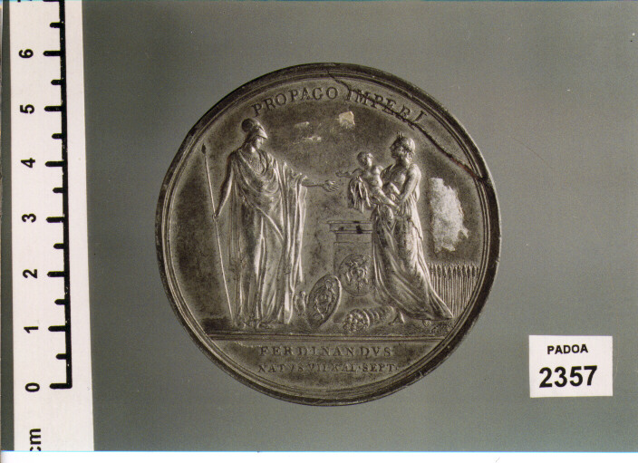 D/ FRANCISCVS FERDINANDI IV M. CLEMENTINA LEOPOLDI II F. , DUE BUSTI ACCOLLATI A D. ; SOTTO, L. SIRIES F. ; IN ESERGO, PANORMI. MDCCC. ; R/ PROPAGOIMPERI, PRESENTAZIONE DEL NEONATO; IN ESERGO, FERDINANDVS/ NATVS. VII. KAL. SEPT